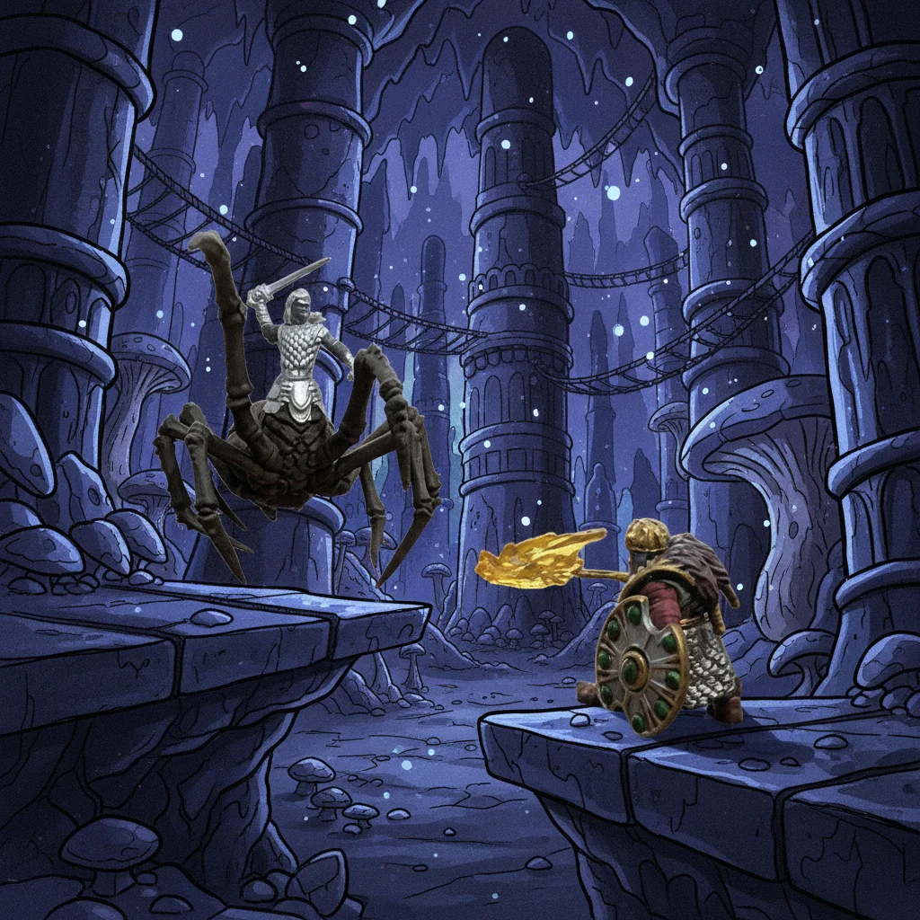 A dramatic 80s cartoon style scene of a Drider and Dwarven Mage locked in combat within a dark Drow dungeon.