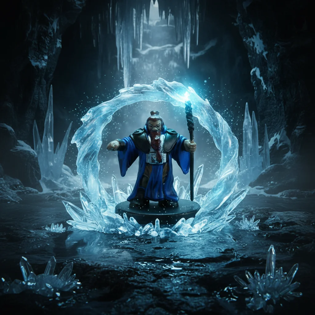 A dwarven wizard action figure stands in a dark, icy cavern, staff extended as if conjuring a magical ice storm.